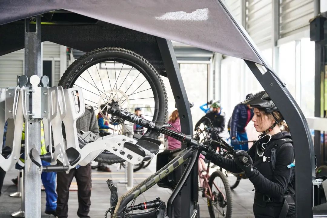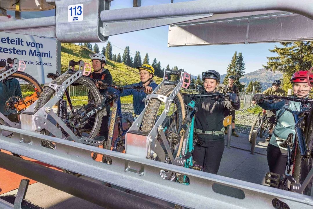 吊椅安装有自行车装载装置,操作非常简单。骑手们将自行车放到前一个吊椅背后的自行车装载装置上,然后乘坐下一个吊椅。索道下站的运行速度很低,操作放置自行车也很简单。在索道上站,手指只需轻轻抬起,就可以取回自行车。在Lenzerheide,每个吊椅可以运送四辆自行车。