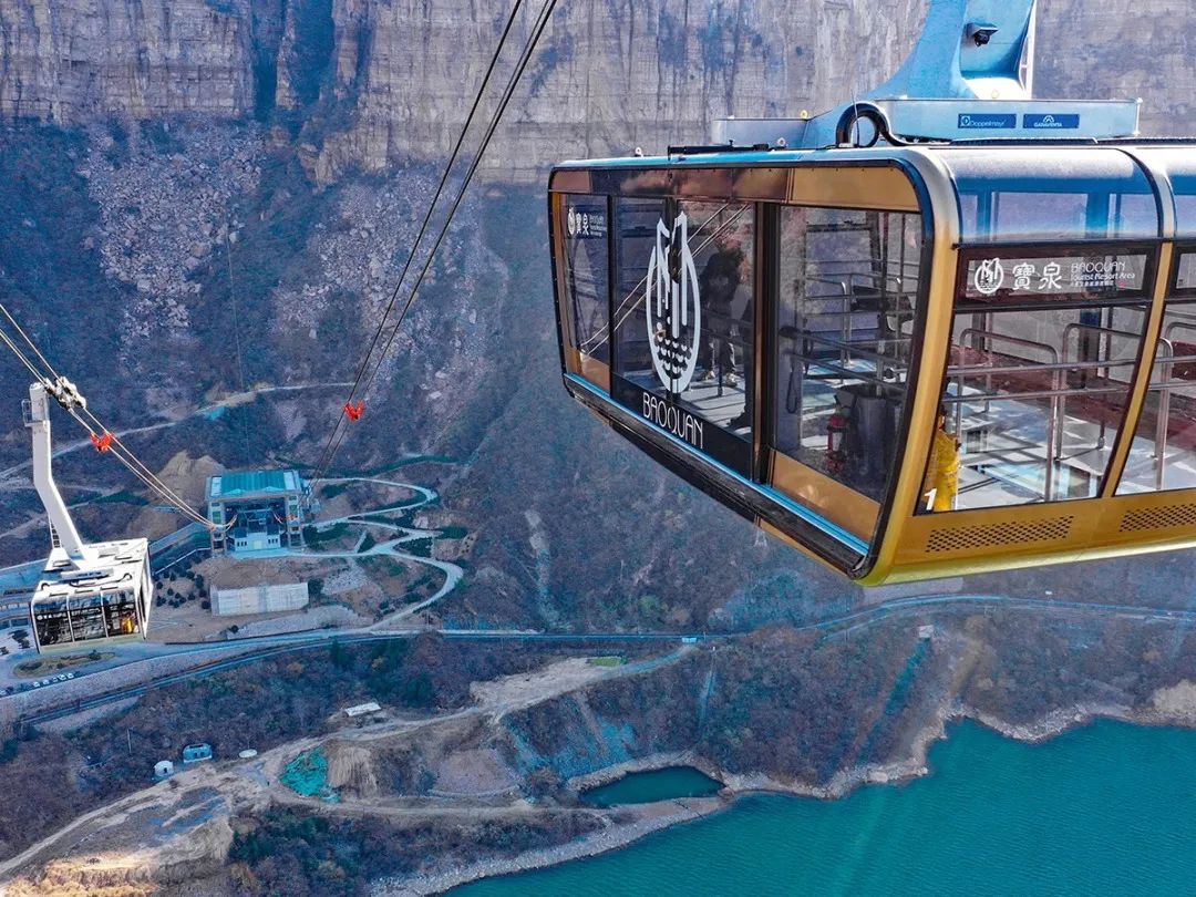 宝泉往复式索道位于宝泉景区1号洞外,全长1100米,高差334米,运行速度10米/秒,拥有2个180人大吊厢,单向每小时可运送2320人。