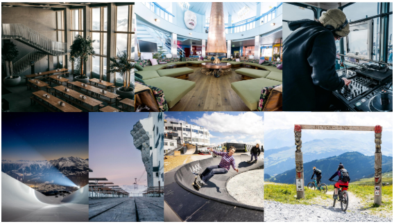 赛事的举办地Laax位于瑞士东部阿尔卑斯山脉中的莱茵河峡谷,拥有壮观的山地景观,成熟的滑雪场、山地车、徒步等丰富的户外运动体验产品,同时也是家庭游客的度假优选目的地。比赛场地选择在海拔2252米的索尼容山顶,也是高山缆车的枢纽站。