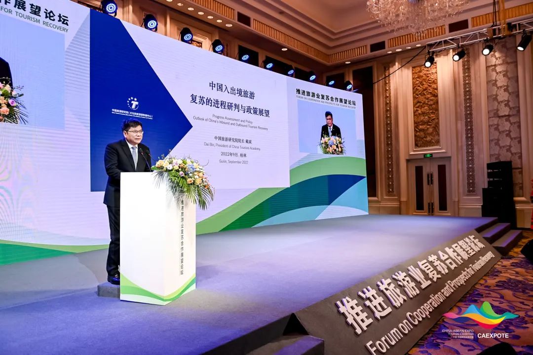 2022年9月19日,中国旅游研究院联合文化和旅游部国际交流与合作局、广西壮族自治区文化和旅游厅、桂林市人民政府共同主办了"推进旅游业复苏合作展望论坛"。9月23日,中国旅游研究院与澳门旅游学院合作主办"粤港澳大湾区高级旅游发展论坛"。在两次论坛上,中国旅游研究院院长戴斌围绕旅游复苏主题,发表了题为《中国入出境旅游复苏的进程研判与政策展望》的主题演讲。