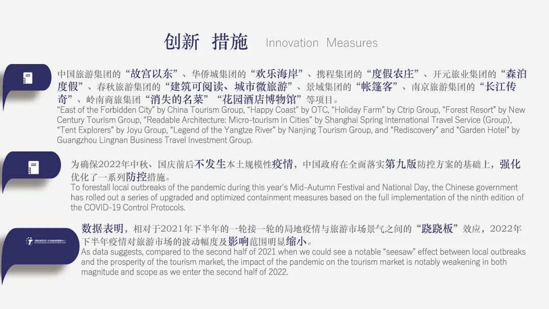 2020年春节以来,中国政府坚持人民至上、生命至上,坚持外防输入、内防反弹、动态清零的疫情防控总方针,统筹推进旅游复工复业和助企纾困工作。从暂退旅行社质量保证金,到恢复省内、国内旅游组团接待和“机票+酒店”业务;从“跨省游熔断机制”精准到县级行政区域,到旅游景区和度假区实施限流、预约、错峰制度;从降息贴息、债务展期、减免租金、发放消费券等投资、财政和金融政策,到缓交有关税费的人力资源和社会保障政策,中央和地方政府对旅行服务、旅游住宿、旅游景区和度假区采取一系列适应中国国情的助企纾困措施,为旅游企业渡过萧条期提供了有力的政策支持。与此同时,政府和教育、科研、商会、行业协会等社会机构一道,共同促进旅游市场主体创新自救和数字化转型。