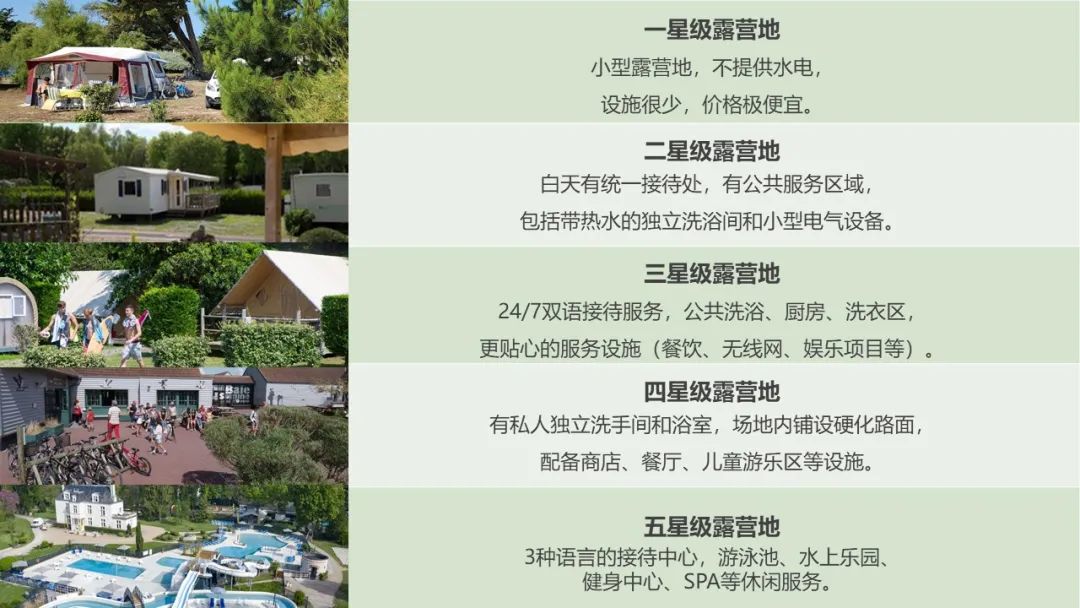 针对现在大火的露营市场,可根据实际情况更新露营地标准,将营地进行分级,统一管理授牌。例如法国就将露营地分为五级,规定每个级别的露营地必须拥有相应的设施。通过露营地标准评级可带动露营地相应的设施改造,推动市场良性竞争,为大众提供更优质的服务和更舒适的体验。