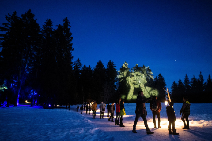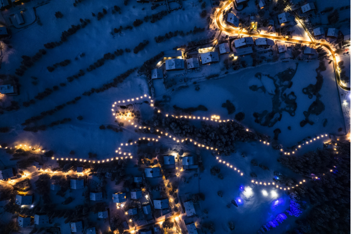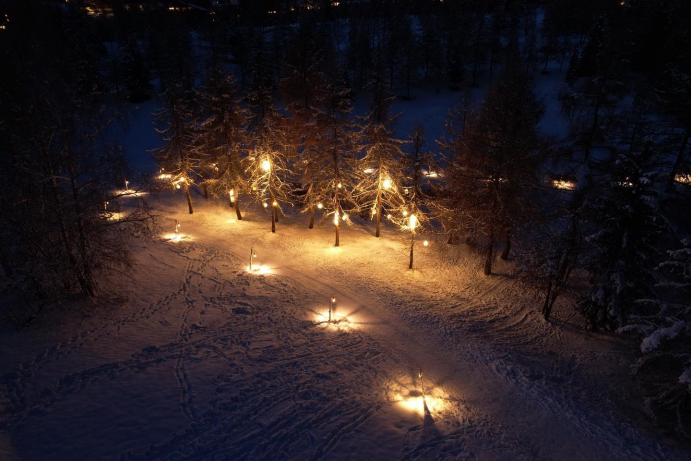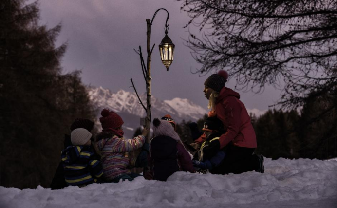 这个简单的小故事在克莱恩蒙塔纳已经代代相传了几十年,在寒冷的冬夜给了人们温暖和力量。当地政府在这个传说的基础上,以故事中的星光路为原型,打造了一条1.8公里长,布满了小型灯笼的徒步小径。行走其中,游客可以拿着寻宝图通过沿途的寻宝讲板和互动装置探索Bella Lui之星的故事。在步道沿途的湖面上还有大型的灯光投影演出,讲述着当地的美妙传说。在步道中心小木屋里,游客还可以品尝地道的山地美食……
