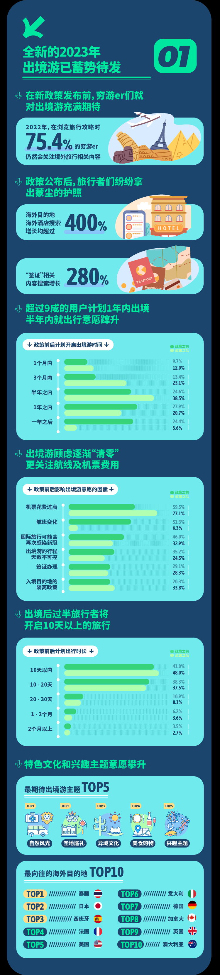 习惯了全球飞的穷游er一直对出境游充满期待。2022年, 75.4%的穷游er在浏览旅行攻略时仍然会关注境外旅行相关内容。新政策发布以来,穷游网站内相关海外目的地、海外酒店搜索增长均超过400%,“签证”相关内容搜索增长280%。政策前后,旅行者计划出行的时间变化显著,超过9成的用户计划在2023年年内就开启出境游,选择半年内出行的用户增长13.9%,达到38.5%,其次是3个月内出行的旅行者,占比为23.1%,也有12%的用户将利用春节假期,在1月就重启出境游。