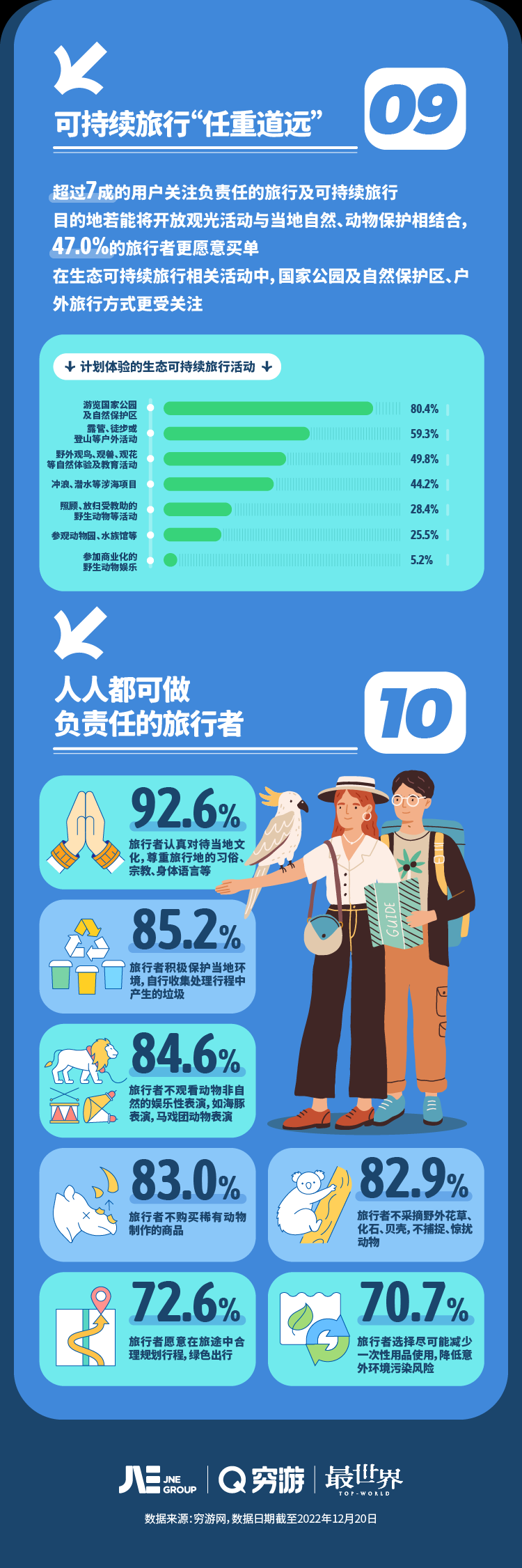 1月16日,在经过持续2个月的用户调研,并结合平台内过亿用户的出行内容及数据后,穷游网发布《会玩的中国人:2022年国人旅行大洞察》(以下简称“报告”)。报告显示,在有序恢复中国公民出境旅游的政策公布后,超过9成的用户计划1年内出境游玩,半年内就出行的意愿提高了25.9%,机票费用过高、入境目的地的隔离政策是影响旅行者们出国的主要因素。一旦出行,62%的用户将开启10天以上的旅行。过去一年游玩国内,穷游er们单次旅行时长显著增加,选择户外旅游、亲子游的人群数量较2021年翻倍增长。多年来,穷游网对“负责任的旅行”理念的持续推广,使得超过7成的用户关注负责任的旅行及可持续旅行,身体力行地成为负责任的旅行者。