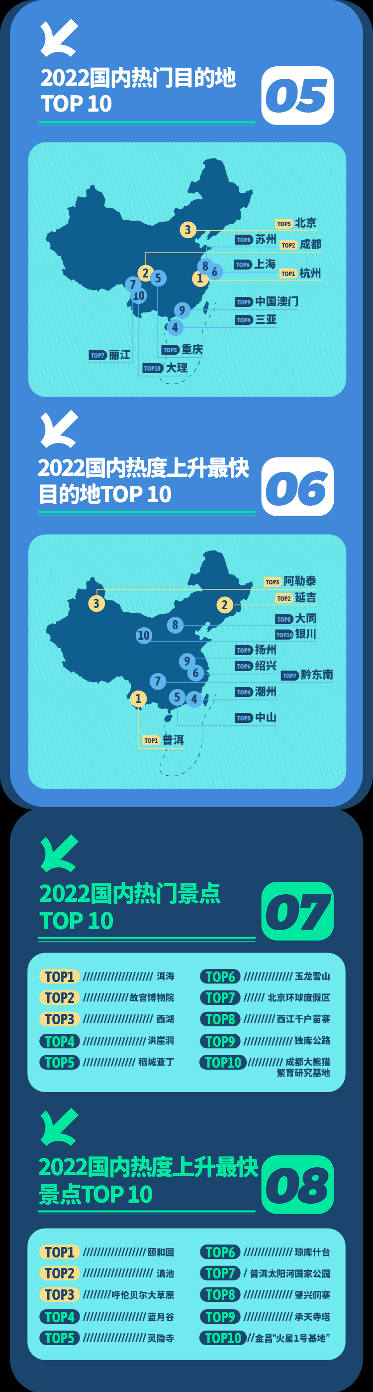 国内年度热门景点方面,洱海成为众多人心中的魂牵梦绕之地,位居榜首。故宫博物院、西湖、洪崖洞、稻城亚丁紧随其后,传说中纳西族保护神“三朵”化身的玉龙雪山吸引更多游客打卡,独库公路成为新疆境内旅行者们的必去之地。2022年,多个老牌景点翻红。颐和园、滇池、呼伦贝尔大草原占据热度上升最快景点前三。有着“小九寨沟”美誉的蓝月谷飞升至第四位,“侗乡第一寨”肇兴侗寨吸引了众人的目光,而金昌“火星1号基地”则凭借为旅行者提供最真实“火星生活”体验关注度猛增。