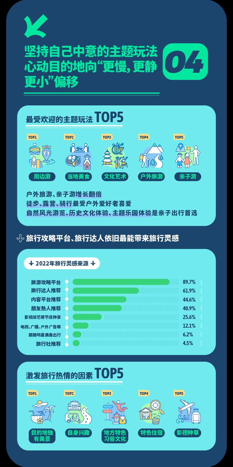 当下的生活分享平台多样,但对旅行而言,旅行攻略平台、旅行达人依旧最能带来旅行灵感,占比分别高达89.7%、61.9%。而真正激发旅行者出行的因素,更多来自目的地独有美景,其次是根据自身兴趣出发,地方特色习俗文化、特色住宿、影视种草分列3-5位。
