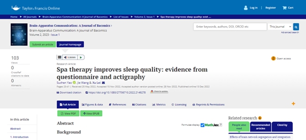 近日,“温泉改善睡眠”课题研究形成论文成果在脑器交互国际期刊Brain-Apparatus Communication:A Journal of Bacomics(简称Bacomics)2023年第1期上发表。论文标题为《Spa therapy improves sleep quality: evidence from questionnaire and actigraphy》(温泉水疗改善睡眠质量:来自问卷调查和活动记录仪的实证),作者为雷旭、王捷、姚苏辰(音)。
