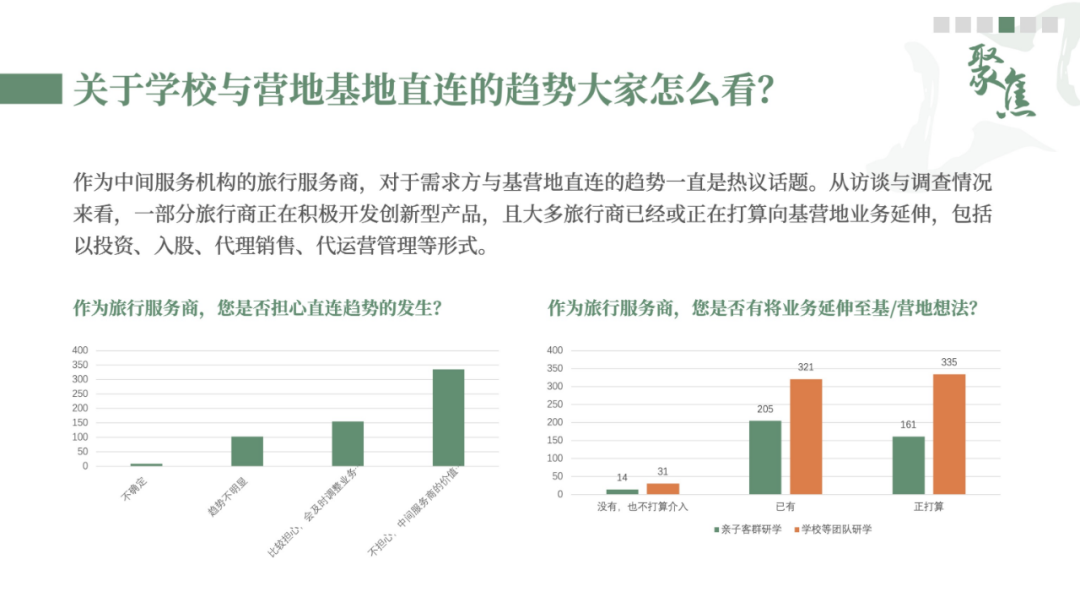 学校端与基地营地的直连趋势一直是行业的关注焦点。从调查数据来看,大多数中介型旅行服务商对此已经思考,或正在进行相应的调整和布局。一方面研学服务商在中长距离、串点成线的研学旅行中的作用是不可替代的。另一方面对于本地研学、周边研学而言,研学服务商也在不断提高产品研发能力,同时以专业技术、渠道合作、投资入股等方式延伸至基地营地的运营业务。