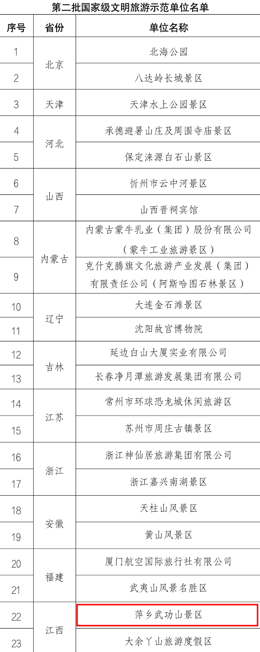 5月8日,根据《文化和旅游部办公厅关于开展〈文明旅游示范单位要求与评价〉(LB/T075-2019)实施工作的通知》,全国旅游标准化技术委员会认定,66家单位为第二批国家级文明旅游示范单位(包括2021年因疫情原因未开展实地评定的9家单位和2022年申报的57家单位)。其中,萍乡武功山景区入选。