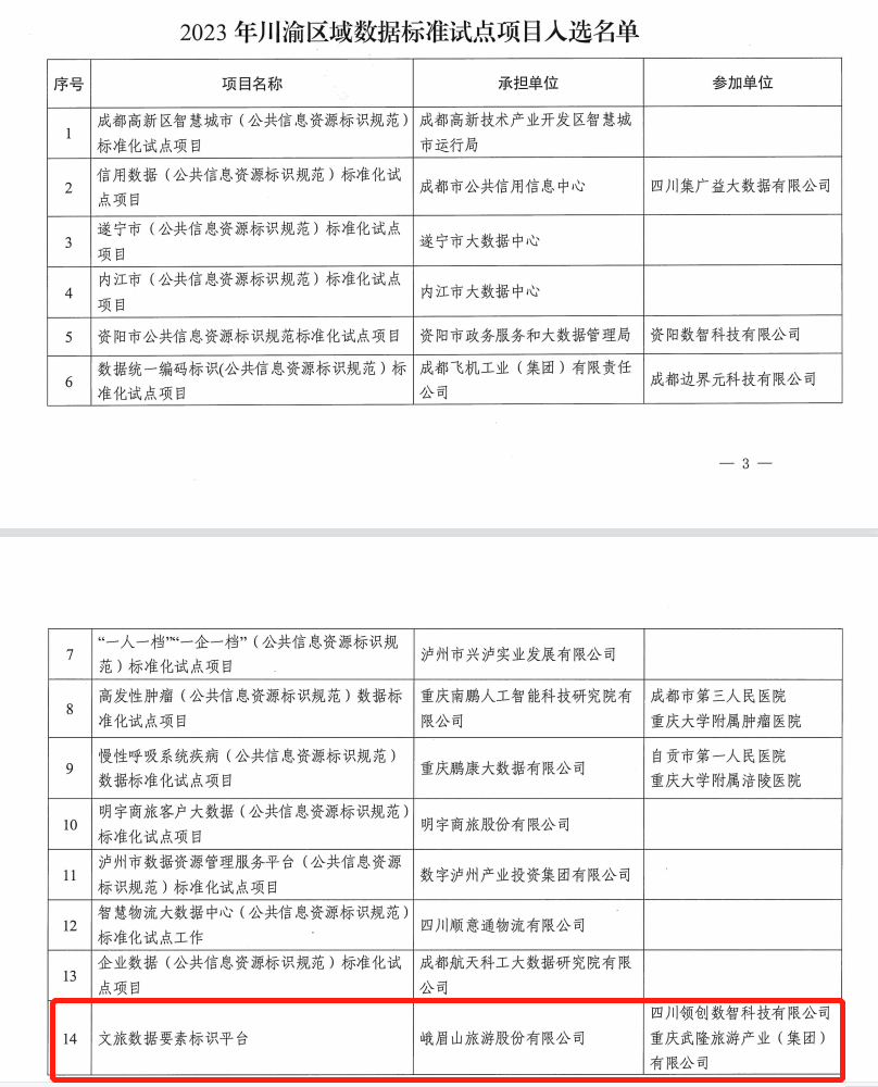 近日,由四川省大数据中心、重庆市大数据应用发展管理局联合主办的数据要素标准创新交流会暨川渝区域数据标准试点启动会在成都顺利召开,峨眉山旅游股份有限公司打造的“文旅数据要素标识平台项目”成功入选2023年川渝区域数据标准应用试点项目,成为此次入选的18个试点项目中,唯一的文旅行业数据标准应用试点项目。