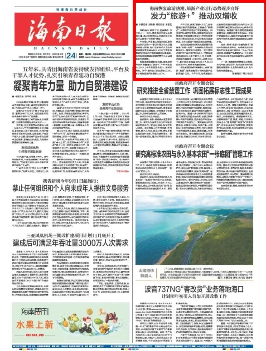 7月24日,海南日报头版报道《海南恢复旅游热潮,旅游产业运行态势逐步向好——发力“旅游+”推动双增收》,呈现海南旅投围绕高质量建设“旅游+”产业,提升强链、固链、补链、延链能力。