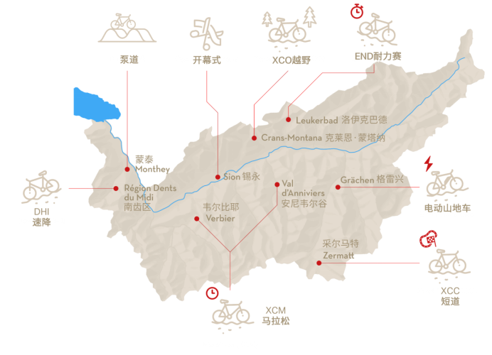 以往我们了解瓦莱州,通常是只了解到冬季冰雪旅游,瓦莱州冰雪资源十分丰富,是著名的滑雪胜地,拥有2800多公里的天然滑雪道和世界上最大的滑雪区齿峰区、瑞士最大的雪区四山谷以及四季都可以滑雪的萨斯斐。与此同时,瓦莱州也很重视夏天产品的开发,瓦莱州的目标是成为瑞士第一大山地车旅游目的地,他们希望山地车成为他们在非雪季期间的一张王牌,而2025年的UCI山地车世锦赛十分契合他们想通过发展自行车和山地自行车促进四季度假的战略。在两年后,瓦莱州将凭借世锦赛向100 多个国家约5000万观众展示其迷人的风光和壮丽的赛道,预计每场比赛将吸引15万现场观众,他们希望由此证明山地自行车也可以像滑雪一样在夏季带来大批游客。