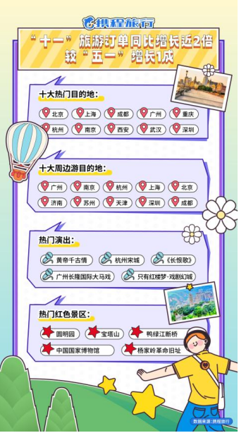 携程数据显示,今年“十一”,国内热门旅游目的地Top10为:北京、上海、成都、广州、重庆、杭州、南京、西安、武汉、深圳。周边游热门目的地Top10是广州、南京、杭州、上海、北京、济南、苏州、天津、深圳、成都。圆明园、宝塔山、中国国家博物馆、鸭绿江断桥、杨家岭革命旧址、周恩来纪念馆、狼牙山、红旗渠、中国人民革命军事博物馆等是比较热门的红色旅游景点。