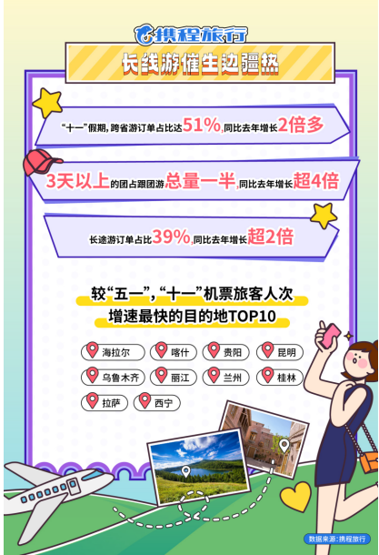 今年“十一”,由于确定性长假,游客较早提前预订行程,并带动跨省游、长途游占比显著提升。携程数据显示,“十一”假期,跨省游订单占比达51%,同比去年增长2倍多;3天以上的团占跟团游总量一半,同比去年增长超4倍;长途游订单占比39%,同比去年增长超2倍。