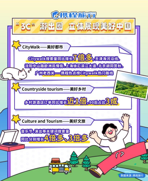 “十一”假期,秋色迷人、气候宜人,适合出游,是许多人饱览祖国山河、发现美好中国的最佳时机。今年“十一”,以都市游(Citywalk)、乡村游(Countryside tourism)、文旅融合(Integration of Culture and Tourism)为代表的“3C”旅游,成为游客发现美好中国的三个侧面。