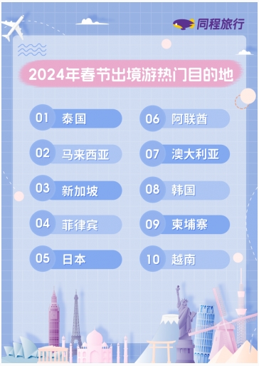 1月11日,同程旅行发布《2024年春节旅行趋势预测报告》。2024年春节有8天休假,加上不少单位会在除夕前放假,中国游客将喜提9天的超长版春节假期。受此影响,春节旅游消费市场空前活跃。同程旅行数据显示,截至目前,2月8日至2月17日之间出发的机票搜索热度同比上涨近2倍,其中国际机票搜索热度同比增长近7倍,超过2019年同期水平。出游方面,“北上看雪”和“南下避寒”贯穿春节假期,作为2024年冰雪游的“当红炸子鸡”,哈尔滨成为2024年春节假期最热门的旅游目的地。东南亚及东亚国家仍是最热门的出境游目的地,阿联酋、澳大利亚等中长线出境游目的地也进入榜单前十。