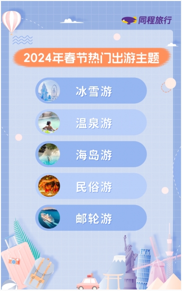 温泉游也是春节假期热门出游主题之一,广东、福建、四川是最热门的温泉旅游目的地。我国东南沿海以及东南亚的海岛游目的地同样受到用户关注。同程旅行平台数据显示,进入1月以来,关于三亚旅游搜索热度环比上涨302%,关于舟山旅游搜索热度环比上涨242%。各地春节期间的民俗活动也受到游客关注。此外,首艘国产大邮轮爱达魔都号出海,则开启了2024年邮轮游的热潮。