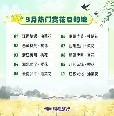 春风吹拂,全国各地的花朵开始竞相绽放,赏花旅游成为春季最受欢迎的旅游活动之一。3月1日,同程旅行发布《2024踏青季旅游出行趋势报告》。报告显示,3月赏花游的热度同比上涨超过3倍,成为春季旅游市场的亮点。江西婺源、西藏林芝、浙江杭州、湖北武汉、云南罗平、贵州毕节、四川金川、新疆伊犁、江苏无锡以及江苏兴化等,成为游客追捧的热门目的地。