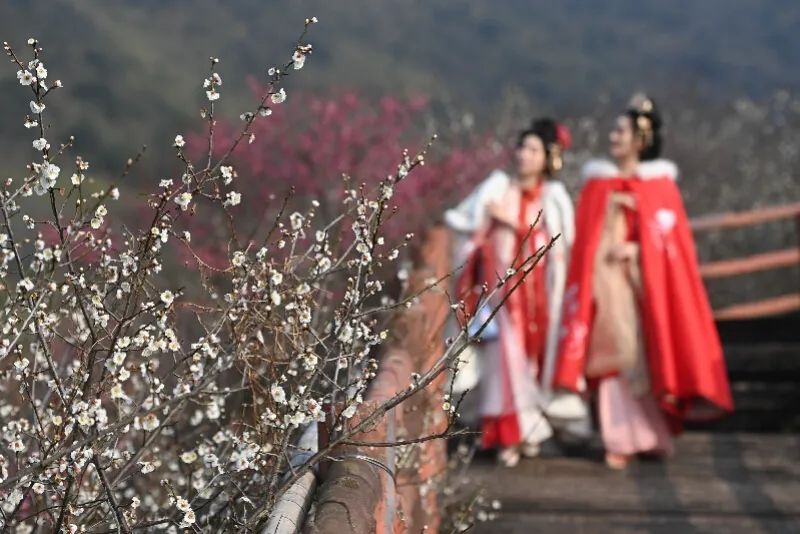 2月27日,身穿古代服装的游客在原乡小镇景区内的瀛洲梅园赏梅。当日,第六届西塞山梅花节在浙江省湖州市吴兴西塞山旅游度假区原乡小镇景区开幕。漫山遍野的白梅、红梅、绿萼梅竞相绽放,吸引不少游客前来观赏。 新华社记者 黄宗治 摄