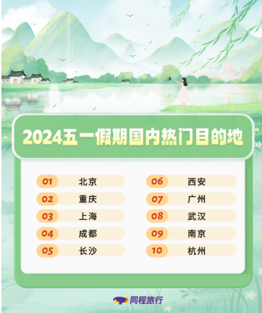 同程旅行数据显示,截至4月12日,北京、重庆、上海、成都、长沙、西安、广州、武汉、南京、杭州是五一假期旅游热度最高的目的地城市。亲子游、文化游、美食游等深度体验玩法,是年轻游客开启假期旅行的新“姿势”。