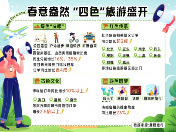 博物馆游学以及各地推出的丰富多彩的非遗活动,让游客在假期感受文化盛宴。五一假期,国内主要博物馆门票订单同比增长10%以上,北京、沈阳、成都、西安、开封等城市博物馆门票订单总量比较靠前,海口、福州、南宁等南方降雨城市博物馆订单增速靠前,同比2.5倍以上增长。五一假期,红色旅游相关景区订单同比增长超2成,北京、延安、南京、丹东、安阳、淮安、上海、长春、邯郸、嘉兴等地红色旅游景区最为热门。
