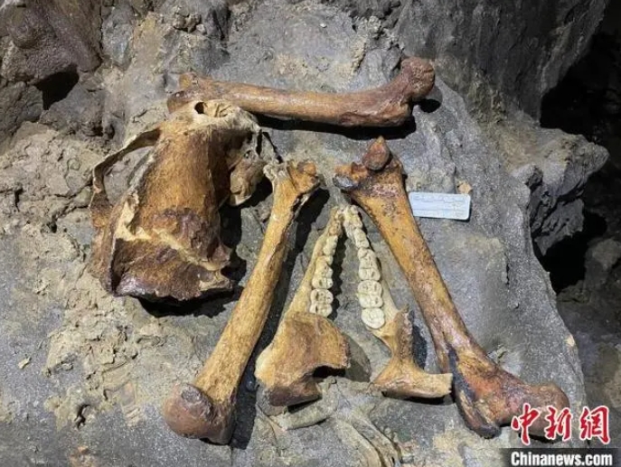 犀牛化石位于双河洞区域的一上层洞穴中。考察人员经一处低矮的洞口进入,利用单绳技术抵达15米深的竖井底部,找到完整的犀牛头骨以及部分腿骨。经现场初步测量,头骨化石长度约为60公分,两排整齐的牙齿清晰可见。