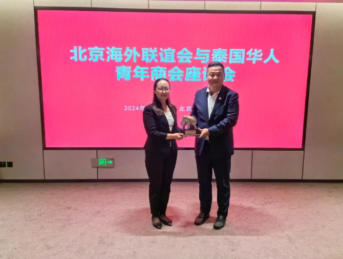 与北京海外联谊会座谈并赠送纪念品。右一为泰国华人青年商会会长李嘉淳