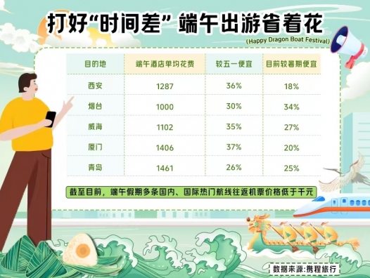 更近一点的省内旅游也是热门之选。根据携程数智酒店数据,随着预订高峰期的到来,预期端午期间本省客源将超过50%,仅住一天的订单占比将超过80%。