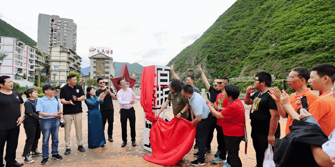 图@在大家的共同见证下,泸定县人民政府副县长且军与国民公路G318文化推广发起人李克崎为“一路向上百折不挠”装置揭幕。
