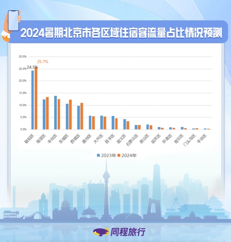7月2日,同程旅行发布《2024北京暑期旅行趋势报告》(下称报告)。报告显示,6月下旬至7月初为北京今年暑期旅游旺季的第一波客流高峰,来自华北及东北地区的游客贡献了主要客流。在今年暑期北京的住宿客流总量中,朝阳区占比超过四成且较去年有所上升,稳居全市第一。“玩在北京,住在朝阳”,是今年北京暑期比较流行的旅游消费方式。