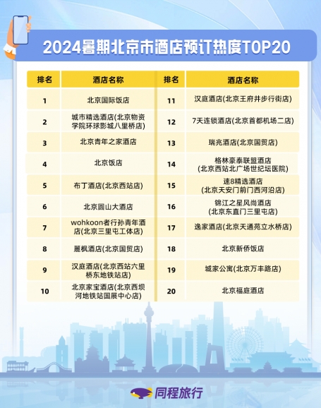 同程旅行数据显示,2024年暑期北京市内酒店的核心客源地主要来源于华北、华东和华南地区,其中,江苏、广东、山东、河北、上海排在前列。预订热度较高的酒店则主要集中在天安门、国贸、王府井等游客接待量较大的区域,首都机场、北京西站、北京南站周边预订热度也较高。