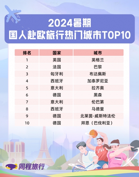 巴黎奥运会接棒欧洲杯,进一步提升了暑期欧洲游热度。同程旅行度假线路预订数据显示,法国、德国位居今年暑期长线出境游热门目的地前列,相关旅游线路的预订热度较去年暑期增长了两倍多。今年暑期,同程旅行平台预订热度较高的欧洲游线路主要有:“德国+法国+意大利+瑞士+维尔茨堡+罗滕堡+少女峰+金色山口列车12天9晚跟团游”、“法国一地+城堡酒店+南特机械岛+香波堡+瓦朗索勒+塞纳河游船晚宴+蒙马特高地12天10晚跟团游”,部分热门线路出游高峰的平均价格超过3万元/人。
