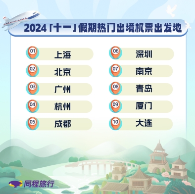随着国际航班数量的快速增加,2024年“十一”假期国际航班价格也有所回落,因此更多游客选择长线出境游。同程旅行平台上,不少国内前往欧洲、中东、非洲等长线目的地的热门旅游产品,在节前一个多月就已提前售罄。“十一”假期期间前往埃及、土耳其、匈牙利、肯尼亚等目的地的机票预订热度同比增幅均达到3倍以上。上海、北京、广州、杭州等机场辐射人群广,出境航班多,成为“十一”假期的热门出境出发地。