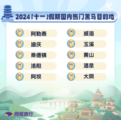除了传统热门城市外,越来越多新兴的宝藏旅游目的地被年轻旅行者挖掘出来,成为假期旅游消费“黑马”。2024年“十一”假期,众多长线目的地上榜黑马榜单。其中,春季爆火的新疆阿勒泰热度延续,云南的迪庆、玉溪,四川阿坝、甘肃酒泉等目的地旅游热度增速较快。山东威海秋季气候宜人,滨海风光也吸引了众多游客关注。黄山秋景成为人们户外登山的热门之选,黄山市也进入了“十一”假期的黑马目的地榜单。