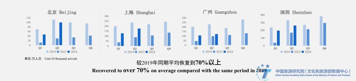从北上广深四个一线城市最新的统计数据来看,2024年上半年,四个城市的入境游客接待规模较2019年同期平均恢复到70%以上,高于一季度的65%。其中,北京和深圳的恢复水平达80%以上,恢复步伐稳步加快。