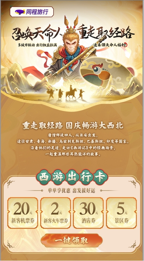 为助力西部地区充分挖掘这一轮“西游热”流量宝藏,同程旅行从“十一”假期开始联合多个西部机场和十余家航空公司发起了“召唤天命人,重走取经路”主题营销活动。该主题活动首期主要覆盖了兰州中川国际机场、成都天府国际机场和绵阳南郊机场,相关的线上活动贯穿了整个国庆假期,吸引了近2000万网友关注,假期过后开启的线下活动每日参与人数接近10万人。本次主题活动获得了13个机场以及中国南方航空、中国国际航空、海南航空、四川航空等十余家航空公司的大力支持。