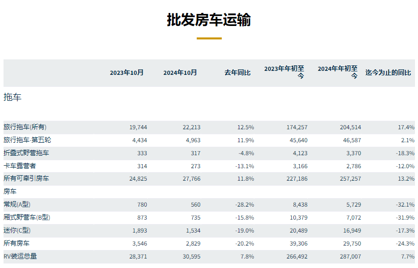 2024年10月,房车工业协会出货量报告图源:房车工业协会