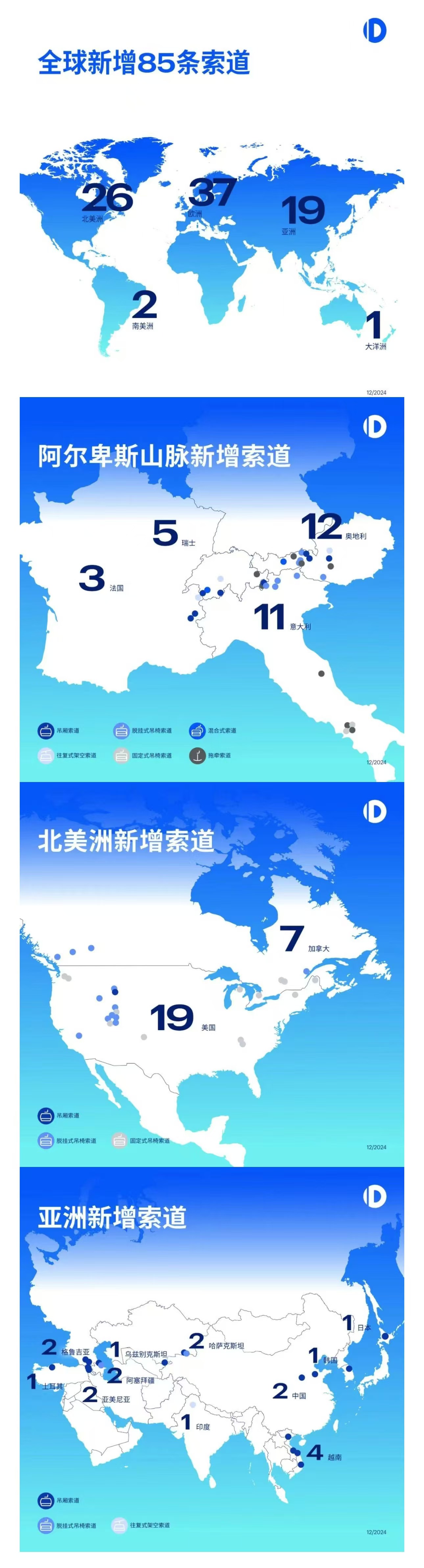 随着时光的流转,我们正站在2024年的尾声,回首这一年,多贝玛亚在全球范围内成功建设了85条新索道,我们为此感到无比的自豪和荣幸。这些索道不仅彰显了我们在技术上的卓越成就,更在高山滑雪、景区乐园以及城市交通等多个领域,为乘客带来了前所未有的乘坐体验。