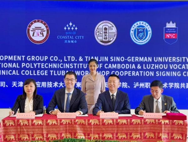 在柬埔寨国公省省长密杜娜·布通女士见证下,滨海城市发展集团董事长李梦晨先生与天津中德应用技术大学党委书记张继东先生、柬埔寨理工学院校长Mr.BUN、泸州职业技术学院党委常委副院长银盈女士共同签署共建鲁班工坊合作协议