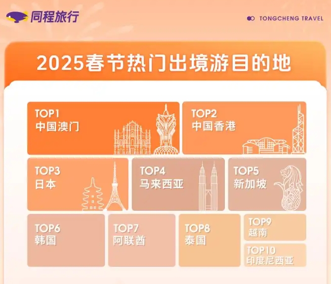 2025年春节,中国游客拥有了8天超长假期,上班族还可以选择“请2休11”“请4休13”等拼假模式,前往更遥远的地方。出境游方面,同程旅行数据显示,2025年春节国际机票整体价格同比略有下降,更划算的机票价格也带动了出境游消费,截至目前,春节假期出行的国际机票预订热度同比上涨超过六成。中国澳门、中国香港、日本、马来西亚、新加坡等是春节假期的热门出境目的地。