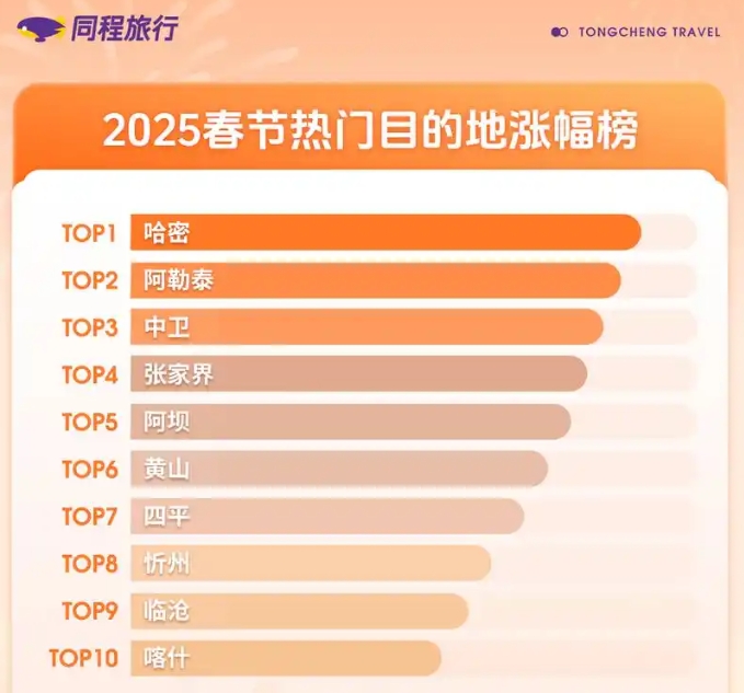 春节假期期间,返乡和出游两大客群成为县域文旅消费主力,小众目的地特别是三四线城市、县级城市的文旅消费热度预计将有更大幅度的增长。同程旅行数据显示,山西忻州、云南临沧等小众目的地进入2025春节热门目的地涨幅榜前十。阳朔县、长沙县、凤凰县、婺源县、平遥县等为代表的热门县域旅游目的地,春节期间旅游市场增长显著。数据还显示,春节假期期间,中西部地区多个城市的县城酒店预订量均有较大幅度增加,当地主要景区的门票预订有近八成来自本地,都与回乡过年人群的消费拉动密切相关。