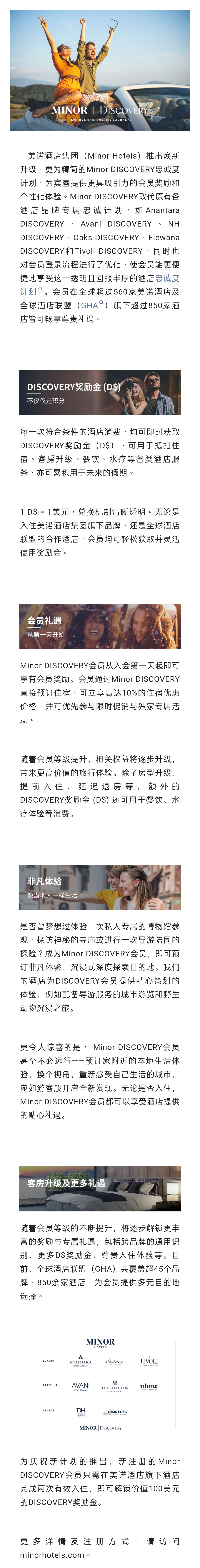 美诺酒店集团推出焕新升级、更为精简的Minor DISCOVERY忠诚度计划