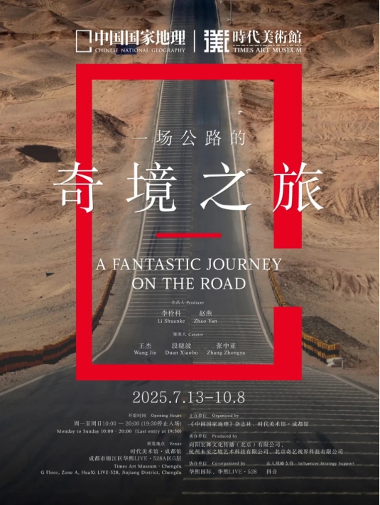 「中国国家地理:一场公路的奇境之旅」特展由《中国国家地理》杂志社、时代美术馆·成都馆联合主办,向阳宏舞文化传播(北京)有限公司、杭州未至之境艺术科技有限公司、北京奇艺视界科技有限公司承办,华熙国际、华熙LIVE·528共同协办,抖音作为达人战略合作伙伴。本次展览将持续至10月8日,诚挚邀请您踏上这场山河史诗的丈量之旅,共同见证公路串连的文明脉络,丰富对中国大地的认识与感知。