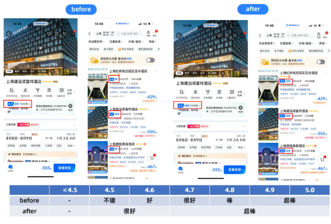 第一,酒店点评分描述将优化,强化优质感知。由于在实际的用户体验中,点评分在4.7分及以上的酒店已经树立了良好的服务口碑。9月起,携程将以4.7分为界点优化评分描述:点评大于等于4.5分且小于4.7分的酒店描述均为“很好”,大于等于4.7分则统一描述为“超棒”。此举旨在增强用户对优质酒店的正向认知,不执着于极高点评分酒店,潜移默化改变住客对酒店的印象,形成“好服务-好口碑-好流量”的良性循环,减少商家为微小分差过度竞争的压力。