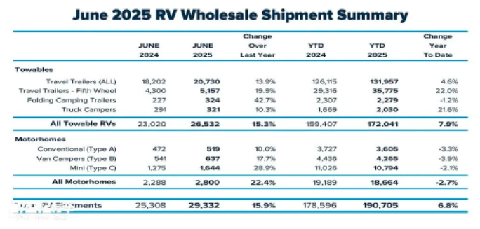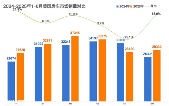 2025年上半年,美国房车市场在经历前期波动后呈现稳步回稳态势,复苏势头显著。根据美国房车工业协会(RVIA)数据,上半年累计销量达190,705辆,较2024年同期的178,596辆同比增长6.8%。其中,6月单月销量为29,332辆,同比大幅增长15.9%,市场活力显著提升。
