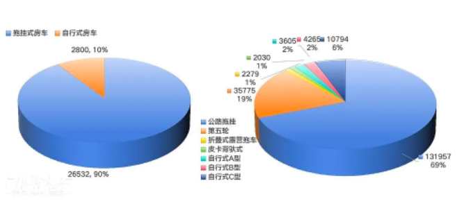 拖挂式房车仍是市场主力,表现尤为亮眼。2025年上半年累计销量达172,041辆,占总销量的90%;自行式房车累计销量为18,664辆,占比10%。从细分类型来看,公路拖挂房车销量最高,达131,957辆,占比69%;第五轮旅行拖车销量为35,775辆,占比19%;自行式C型房车位列第三,销量为10,794辆,占比6%。这三类车型凭借宽敞的内部空间和稳定的行驶性能,成为长途家庭旅行的热门选择。