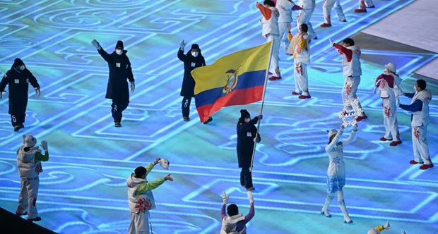 2022北京冬奥会开幕式上,厄瓜多尔代表团旗手、高山滑雪运动员莎拉·埃斯科巴尔(中)是该国史上首位冬奥女选手。新华社记者 黄宗治/摄