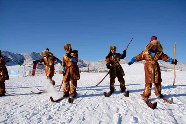 新疆的的毛皮滑雪板有一万年的历史,作为当地人的冬季出行工具