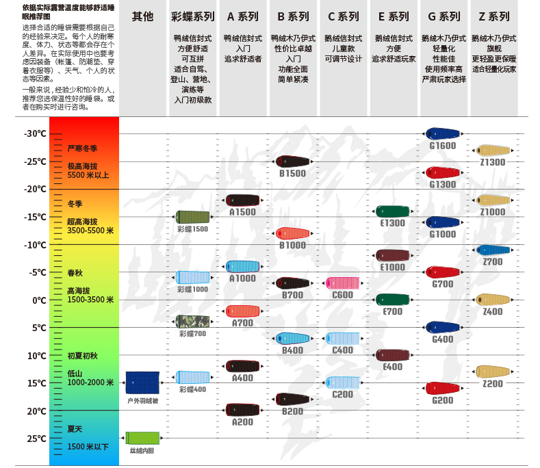 但是要注意的是,大部分棉睡袋和一些杂牌子羽绒睡袋上的温标数值非常不靠谱,不要执着于产品本身的标注,且建议选购大牌专业产品。